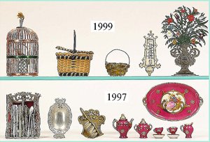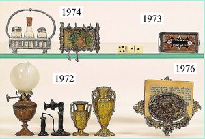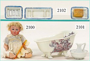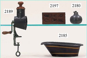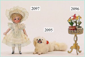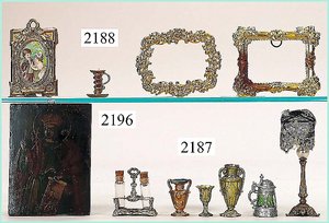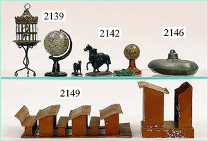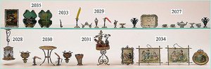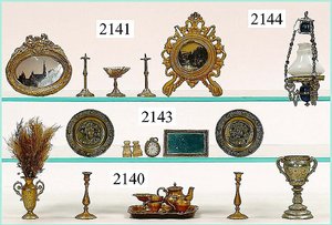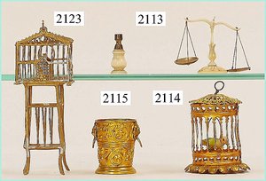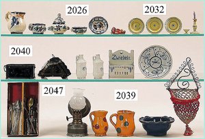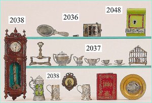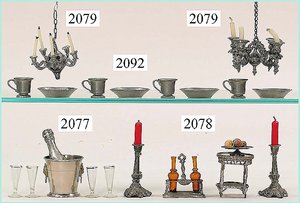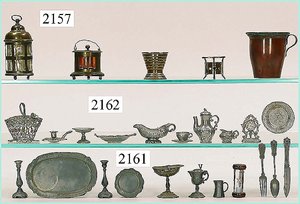 schönes Konv. Puppenküchenteile, Besteckteile, Platten, 2 Leuchter, aufwendig gearbeitete Eieruhr, 3 Glasteile, Krug mit Deckel, 4 cm (n. a. T. f.)