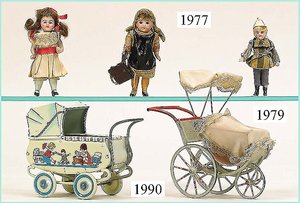 Puppenstuben-Kinderwagen, Blech handlackiert, mit kl. Ganzbiskuitkind, 10 cm, guter Zust. Orig.-Verdeck