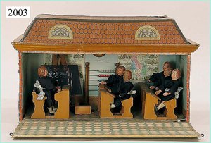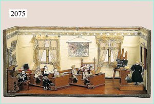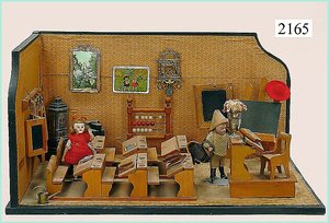 Puppenstuben-Schule, 41 cm lang, 34 cm tief, Lehrerpult, Bänke, mit angedeuteten Tintenfässern, Zubehörteile, 2 Puppenstuben-Puppen, Ganzbiskuit, Gehäuse neuer