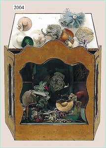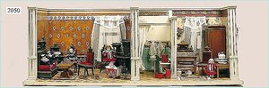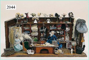 Kaufladen, um 1900, 57 cm breit, 28 cm hoch, Schubladen mit geschwungenen Blochschildern, seitlich Schaufenster, alte Tapete an Wand u. Boden, teilw, etwas verschlissen, alte Bemalung, mit Orig.-Theke u. reichhaltigem Zubehör