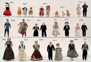 2 Puppenstuben-Puppen, 9,5 cm, fester Kopf, fest eingesetzte Glasaugen, bewegl. Arme u. Beine, schöne Orig.-Kleidung