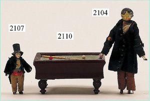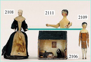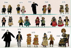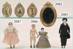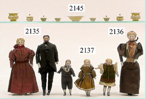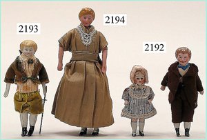 2 Puppenstuben-Puppen, Mann, 12,5 cm, Biskuitbrustblatt-Kopf, anmodellierte Schnurrbart, Ganzbiskuit-Mädchen, fester Kopf, fest eingesetzte Glasaugen, bewegl. Arme u. Beine, alte Kleidung, 9,5 cm