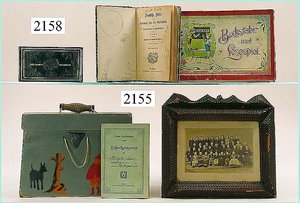 Schulkonv. früher Holzranzen, Buchstabir u. Lesespiel, deutsche Fibel, 1911, Fibel für den 1. Unterricht in Deutsch, ca. 1910, S. Schilling, das Tierreich, Grundriss der Naturkunde, 1903, Fibellesebuch für Landschulen 1928, Schulzeugnis vom 27. August 1911 - 1913 eines besonders guten Schülers, dazu Klassenfoto mit Lehrer, Holz gerahmt, 12,5 cm lang (n. a. T. f.)
