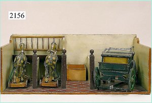 Stall, vor 1900, 60 cm, Orig.-Bemalung innen u. außen, 2 Zugpferde, Kutsche Holz, handlackiert