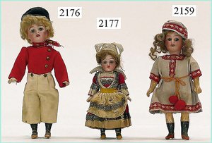 3 Puppenstuben-Puppen, Ganzbiskuit, 10 cm, feste Köpfe, fest eingesetzte Glasaugen, bewegl. Arme u. Beine, aufgemalte Schuhe u. Strümpfe, schöne Orig.-Kleidung, für Puppenstube o. Puppenschule