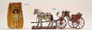 Pferdegespann, vor 1900, 52 cm, Holz- u. Blechteile, handlackiert, Guss-Speichenräder, 2 frühe Papiermaché-Pferde, auf Holzbrett, mit Blech-Speichenrädern, schöner Orig.-Zust., Laternen ergänzt, schöne Deko für 1 gr. Puppenhaus