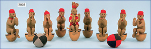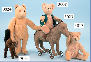 STEIFF Kegelspiel, ca. 1895, 8 Kegel, 19 cm hoch, dazu 1 Affenkönig 23,5 cm, Filz, Schuhknopfaugen, teilw. altersbedingt etwas Filzschäden, jedoch insges. schöner Orig.-Zust., mit 2 Filzbällen, museal