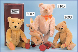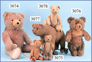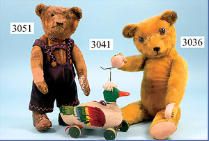 Bär, ca. 1910, auf 4 Pfoten, Gussspeichenräder, Schuhknopfaugen, Mohair kompl. abgegriffen, einige off. Stellen, Zugstimme intakt, 43 cm
