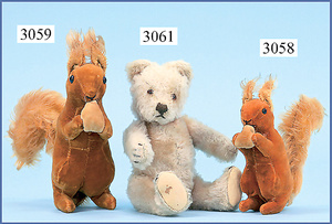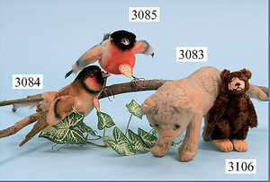 STEIFF 4 Teile Wolltiere, 3 Teile mit Knopf u. Fahne, Ulmer Spatz 6508,45, 7123/09, Singvogel, 1 Frosch, 7180-05, 1 Eichhörnchen, ohne Knopf u. Fahne
