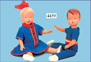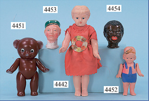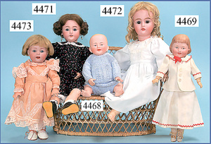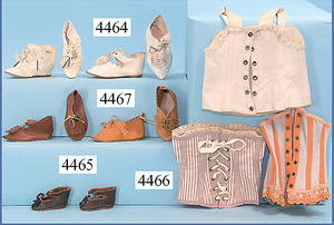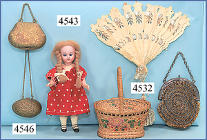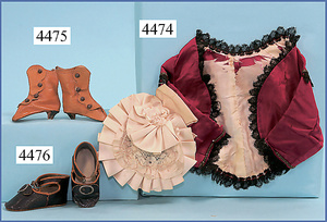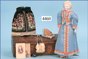 BRU J.neR9, Biskuitporzellan-Puppe, Paris ca. 1892, 56 cm, heller feiner Biskuitporzellan-Kurbelkopf, schöner geschwungener off. Mund, oben Zähne, tiefblaue Paperweight-Augen, fein gemalte Wimpern u. Augenbrauen, rote Augenwinkelpunkte, natural, geformte Ohren, Ohrringe, helle beige/graue Fellperücke (Sheepskin-Perücke) auf Orig.-Korkdeckel, gut erhaltener Comp./Holz-Gliedergelenkkörper, Laufmechanismus, Mama-Stimme, rechte Hand Gruß-Kußhand mit Kordelzug, Kleidung alt o. aus alten Stoffen genäht, franz. Lederschuhe, alte Schuhe, alte Strümpfe und alte Unterwäsche