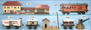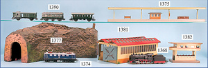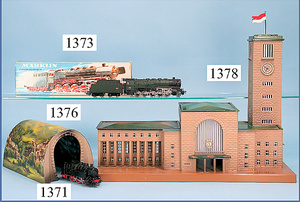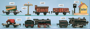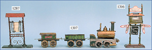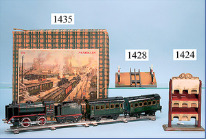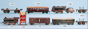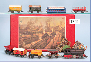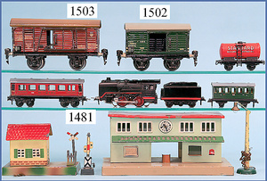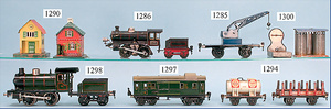 KEIM Zug, Spur 0, Schlepptenderlok B, 2 Wagen, Gleismaterial, Signal, kl. Bahnhof, sowie 2 lithogr. Tunnel, im Orig.-Kart., neuwertig