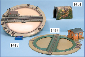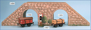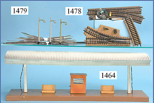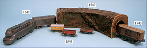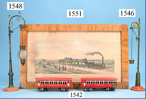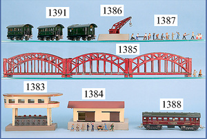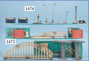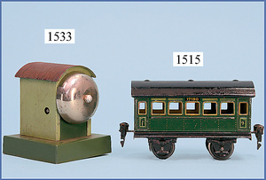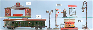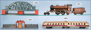 MÄRKLIN Konv. Spur 0, Bogenbrücke in Teilen zerlegt, 1 Läutewerk, Flugrost, 1 Uralt Lampe BING, Lampenglas fehlt, 37 cm, Lackfehler, 1 Bahnhof, wohl BING Tischbahn, in Teilen zerlegt