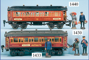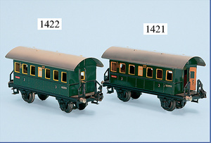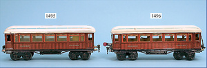 LIONEL 1690, Personenwagen, sowie 1691, Personenwagen mit Aussichtsplattform, Blech lithogr., 4-achsig, Spur 0, bespielt, Lackfehler