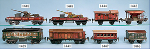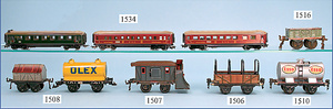 MÄRKLIN Spur 0, 5 Güterwagen, 2 Kipploren, 2 Planewagen, ohne Plane, off. Güterwagen, 13 cm, bespielt - gut