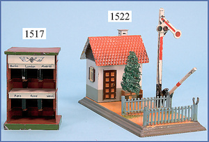 2 Teile Bahnwärterhäuschen, 1x BING; Blech lithogr., mit Beleuchtung, 12,5 cm, 1 Haus, Nr. 25, beleuchtet, bespielt, Lackfehler
