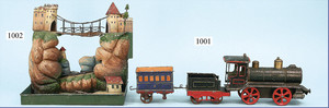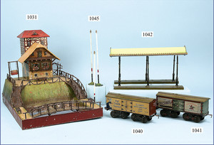 außergew. Blechlandschaft, Haus am See, mit Brücke, Holztreppe, Wohnhaus mit sehr aufwendiger Bemalung, seitl. kl. Schaukel, Wasserbecken mit Wasserfontäne, Haupthaus diente als Wasserbehälter, sehr schöner unberührter Orig.-Zust., eingeliefert von einem alten Biberacher Spielwarengeschäft, Grundplatte 38 x 57 cm, sehr schöne Deko. zu einer Märklin Uralt-Anlage, makelloser Orig.-Zust.