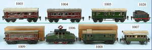 BING Schlepptenderlok B, Spur 1, Blech lithogr., 2-achsiger Tender, Frontseite übermalt, techn. nicht geprüft, teilw. farblich ausgebessert u. ein wenig verändert, dazu 2 Personenwagen, guter Zust.