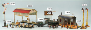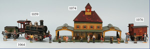 Bahnhof, Spur 0, Vorkrieg, Blech lithogr., vorne 2 Türen, Überdachung, lithogr. Durchgangsbereich, mit Fahrzeug u. Passanten, hinten Zugmotiv, sowie 2 Türen, bespielt, guter Zust.