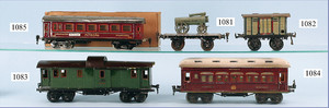 MÄRKLIN Uralt, Bodenläufer, mit Uhrwerkantrieb, Schlepptenderlok B, Blech, handlackiert, durchbrochene Gussräder, mit Kurveneinstellungen, durch Hebel im Heizraum, 1 Puffer, sowie Schornstein fehlen, bespielt, Orig.- Tender, Haken zwischen Lok und Tender fehlt, unberührter Dachbodenfund, dazu 1 Personenwagen, 1 Achse vorhanden, Dach fehlt, Lackierung in gutem Zustand