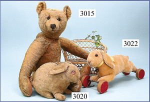 STEIFF Hase, Vorkrieg, mit Drehkopfmechanik, 38 cm, mit Knopf, Reste d. roten Fahne, Fell am Schwanz etwas aufgerieben, sonst bis auf kl. Stellen altersbedingter, guter Zust., 1 Auge etwas locker, ausdrucksstark, selten