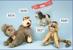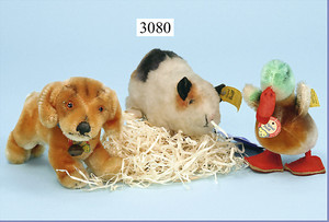 STEIFF 3 Teile, 60er/70er Jahre, Swinny, kompl., Nr. 2250/09, 1 Ente, kompl., Nr. auf Fahne 6311.07, 1 Bazi, mit Schild, Halsband, ohne Knopf u. Fahne