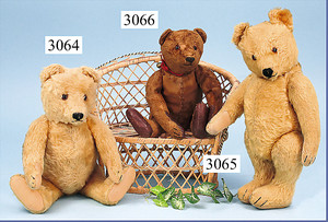 wohl BING Bär, 65 cm, Schuhknopf-Augen, lange abgeknickte Arme, ausgeprägter Buckel, abgeliebt, Stoff an einem Bein stärker eingerissen, Tatzen übernäht, 1 Arm liegt lose bei, sehr schöner Ausdruck, außergewöhnl. Gr., ca. 1915
