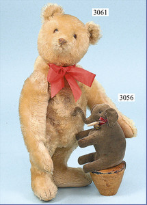 STEIFF Pucky, mit Schild, Vinylkopf, 52 cm, Filzkörper, 3 Finger an der l. Hand beschädigt, Filzkleider, Lederschuhe, etwas vergilbt bzw. verschmutzt, Farbabrieb im Gesicht, sonst guter Zust.