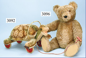 STEIFF Schildkröte auf Rollen, 60 cm, ohne Knopf u. Schild, Metallteile mit altersbedingten Lackfehlern, sonst Mohair gut