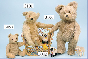 STEIFF Bär, ca. 1925, 36 cm, weiß (etwas eingegilbt ), helle Bestickung, lange abgeknickte Arme, leichter Buckel, mit Knopf, Druckstimme defekt, Tatzen etwas verschmutzt, jedoch in gutem Zust., kl. Stellen Mohairverlust, 1 Stelle unter dem Hals Stoff etwas aufgegangen, schöner Ausdruck