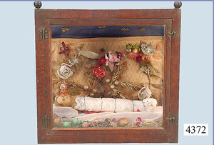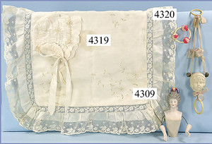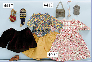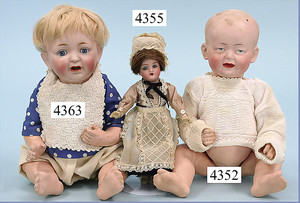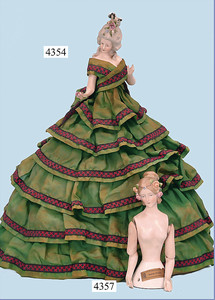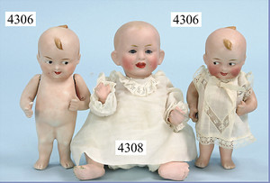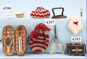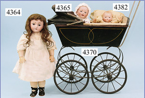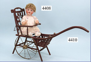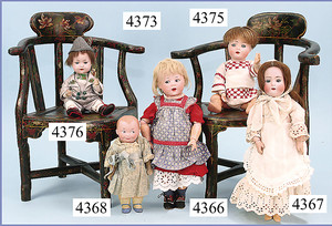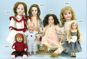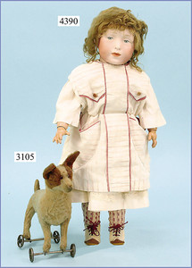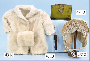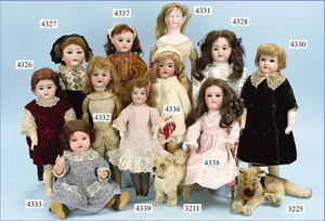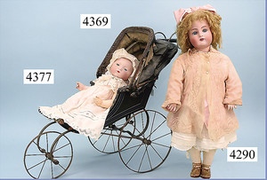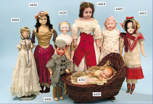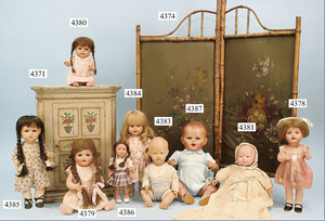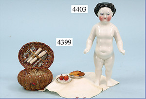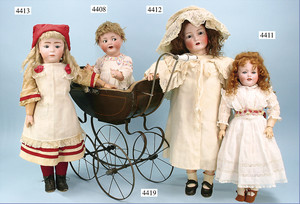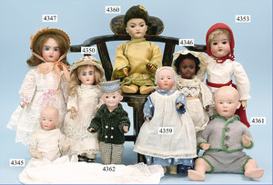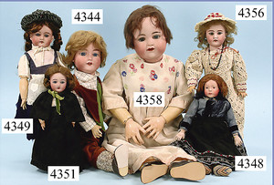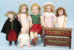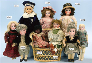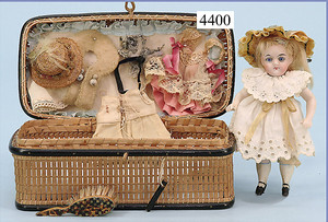 JUMEAU Biskuit-Porzellankopf-Puppe, Frankreich, gemarkt Nr. 8, frühe Emile Jumeau, 45 cm, gepresster Biskuit-Kurbelkopf, mit angesetzten Ohren, braune fest eingesetzte Glasaugen, geschl. Mund, Orig.-Spiraldraht, Befestigung am Kopf, Körper mit 8 losen Kugeln, feste Handgelenke, Orig.-Korkdeckel, alte Perücke, Fingerkuppen an einer Hand fehlen, Daumen an d. anderen Hand berieben, sonst Körper gut, gestempelt mit blauem JUMEAU-Stempel, alte Gummis, sehr schöner Ausdruck, schöner unberührter Dachbodenfund