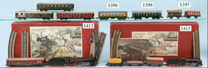 BING Straßenbahn, Blech lithogr., Spur 0, 2 Motorwagen, mit passendem Gleismaterial, als Wechselschaltung, beide Uhrwerke intakt, bis auf minim. Druckstellen am Dach, sehr schöner Orig.-Zust., mit passendem Gleismaterial, Signal 1 Haltelasche weggebrochen, dazu 1 BING Sperre, bespielt, außergew. so kompl.