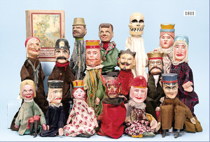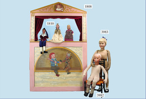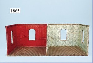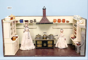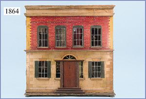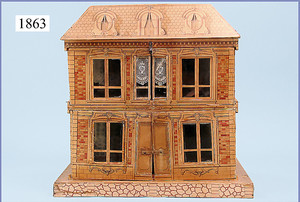 engl. Puppenhaus, 71 cm hoch, 71 cm breit, 34 cm tief, Fassade mit Fenstern, Eingangstür mit Treppe, alte Bemalung, teilw. farbl. etwas ausgebessert, innen 4 Zimmer, fest eingebaute Kamine, Küche mit eingebautem Herd, alte Tapete, ca. 1890