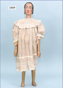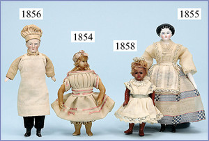 Puppenstuben-Puppe, Biedermeier, 16 cm, China Head, Brustblattkopf, glasierte Porzellanarme u. -beine, mit aufgemalten Schuhen, Stoffkörper, schönes Orig.-Kleid u. Unterkleid, außergew. Zust.