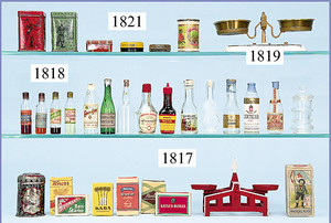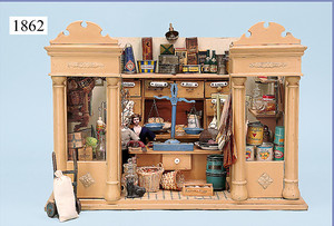 Kaufladen, 49 cm breit, vorne 2 Schaufenster, innen Regale, hinten Regalwand mit Schubladen, wohl teilw. etwas überarbeitet, reichhaltiges Zubehör, Schachteln, Dosen, Porzellan- u. Glasteile, 2 kl. Stubenpuppen, einige Gerichte neuer