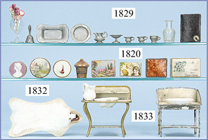 Puppenstuben-Ausschmückungsteile, Zinn, Tassen, Teller, Kaffeekanne, Platten, kl. Glocke, kl. Kalender, 1899, 2 Glasvasen (n. a. T. f. )