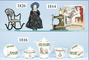 Puppenküchen-Möbelprogramm, für kl. Küche, Schrankhöhe 19 cm, dazu einige Porzellanteile (n. a. T. f. )