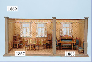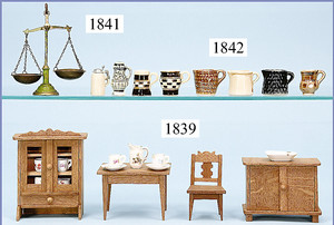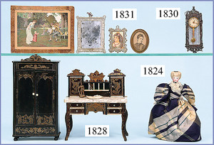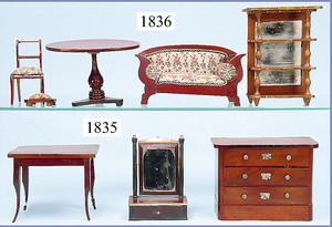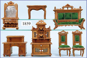Puppenstuben-Möbelprogramm Gründerzeit, Sofa, 19,5 cm, Büffet Höhe 21 cm, Schreibtisch, Tisch, 2 Stühle, Spiegelkommode