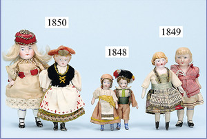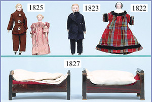 2 Puppenstuben-Puppen, Kinder, Ganzbiskuit, 6 cm, Kurbelkopf, bewegl. Arme u. Beine, sehr schöne Orig.-Kleidung