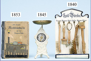 kl. Puppenküchenherd, 13 cm, Löwentatzenfüße, Schornstein, mit Brenner, 1 Topf, 2 Deckel fehlen, dazu einige Holzteile, Wiegemesser, Weißblechteile, Sieb, 1 Kupferschüssel