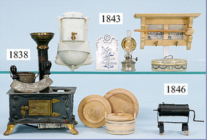Konv. Puppenküchenteile, 2 Porzellanbrettchen, blaues Dekor, 1 Brotdose, Blech lithogr., 7 cm, 1 Wandhalter Holz, 1 Petroleumlampe, 1 Wasserbehälter (n. a. T. f. )