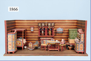 außergew. bäuerliche Puppenstube, ca. 1910, 78 cm breit, 33 cm hoch, 40 cm tief, hinten Fenster, möbliert, mit hochwertigen handbemalten bäuerlichen Möbeln, Himmelbett, Schränke, Kamin mit Bank, Sitzgruppe, Kruzifix, Heiligenbilder, Uhr, Wiege, einige Kleinteile