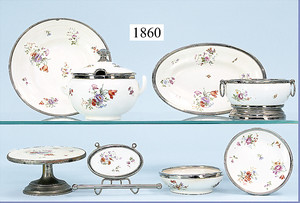 Puppen-Speiseservice, RÖSSLE für MÄRKLIN, Suppenschüssel, 1 Griff weggebrochen, 10 cm, einige Teller, Schalen, Kuchenplatte, 1 Wandhalter, Keramikteile von Rössle, Metallteile von Märklin gefertigt (n. a. T. f. )