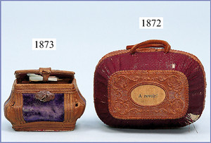 kl. Puppentasche, mit Nähutensilien, Riemen am Verschluss fehlt, kl. Fehler an den Ecken, 5 cm, ausgef.