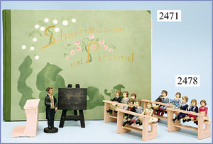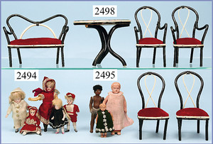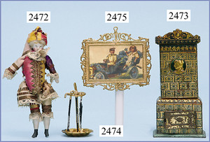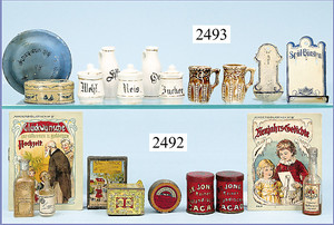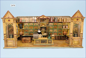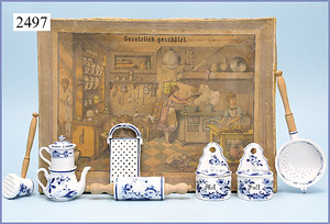 Rauchfangküche, 81 cm breit, 40,5 cm hoch, 46 cm tief, fest eingebautes Regal, Eckschrank, Bank, Tisch u. Stühle, 1 Küchenschrank, Rauchfang, früher Herd, Schornstein ergänzt, Backstein-Muster, Messing-Türen, Porzellan-Griffe, reichhaltiges bestückt, mit teilw. hochwertigen Zubehör-Teilen, blau/weiß emailliert, Porzellan-, Holz- u. Blech-Teile, Orig.-Bemalung, Bierlack außen, schöne Orig.-Bodenbemalung, alte Wandbemalung, Küche ca. 1880, Zubehör bis 1910, dazu 1 GROEDNER TAL Holz-Puppe, mit angeschnitzter Nase, 24 cm