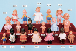Kewpie, Celluloid, Deutsch, 13 cm, fester Kopf, seitl. geneigt, seitl. blickende gemalte Augen, kl. anmodellierte Flügel, mit Orig.-Aufkleber, guter Zust.