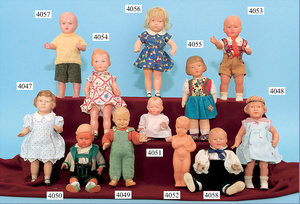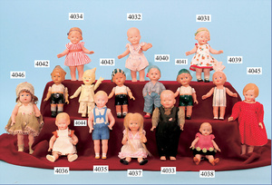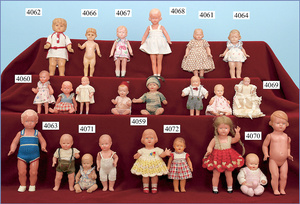 SCHILDKRÖT Bärbel, 18 1/2 19 cm, Celluloid, fester Kopf, stark ausmodellierte Haare, bewegl. Arme u. Beine, Orig.-Kleidung u. Schuhe, unbespielt