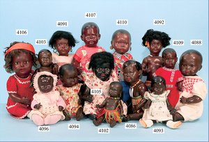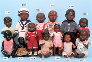 PAUL HUNAEUS Celluloid-Puppe, schwarz, 40 cm, Igodikopf, braun fest eingesetzte Glasaugen, off./geschl. Mund, Celluloid-Stehkörper, sehr guter Zust., selten