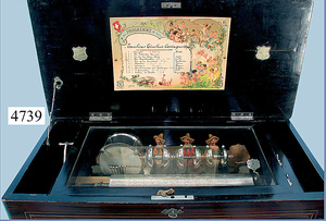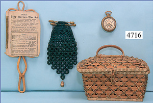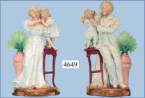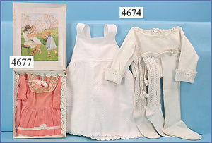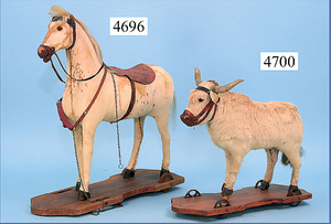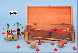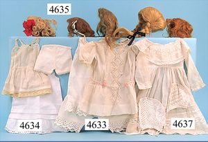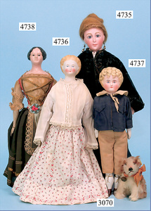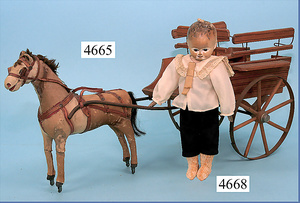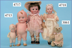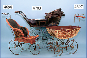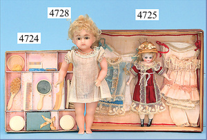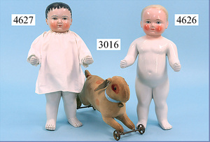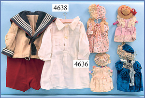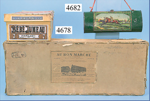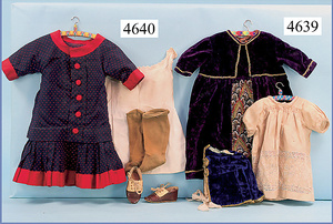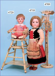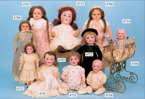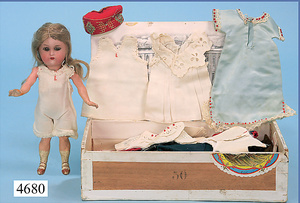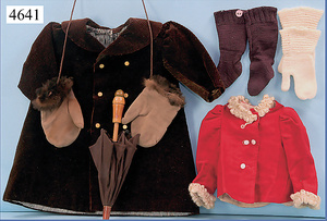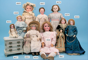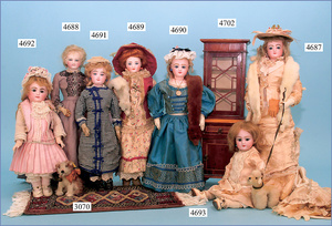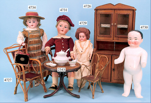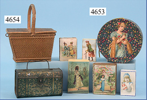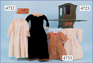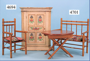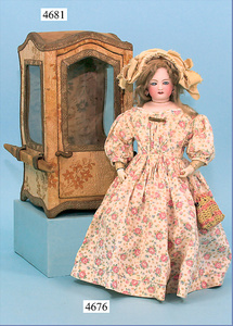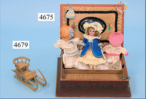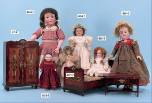 9 Teile Puppen-Deko, Schlafzimmerschrank, 1927, mit Jugendstil-Ornamenten, aufgemaltes Furnier, 38 cm hoch, Bett 43 cm lang, 1 Nachtschrank, aufgemaltes Furnier, Messingverzierungen, Frisiertisch mit Kippspiegel, 20,5 cm breit, Schublade, 2 Schränke, Spiegelglas fehlt u. Sitzgruppe bestehend aus 2 Stühlen, Bank, Tisch, 25 cm breit, aufklappbar, aufgemaltes Furnier, Messingbeschläge, Garderobe, guter Zust., 1 Tür liegt lose bei, ca. 1925, schöne Puppen-Deko