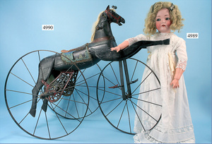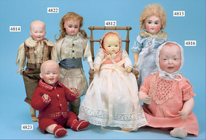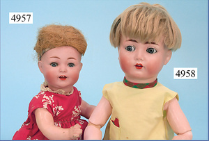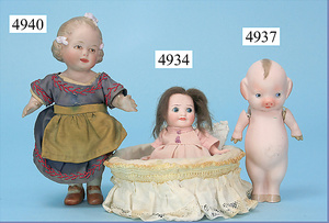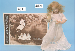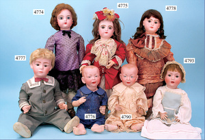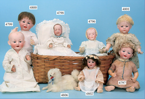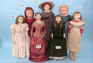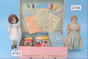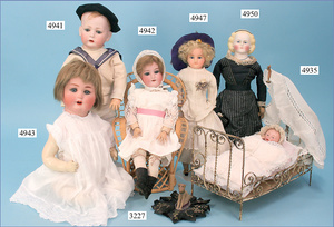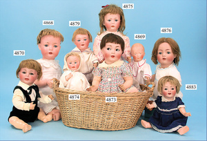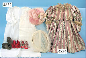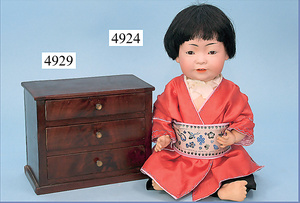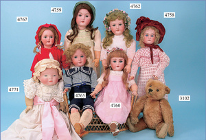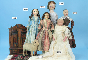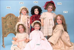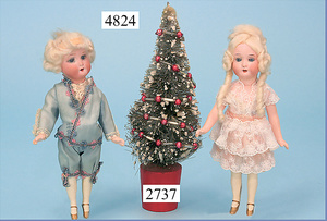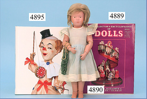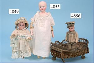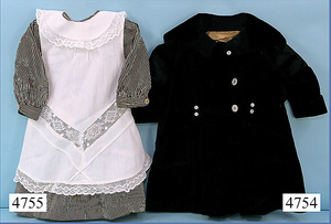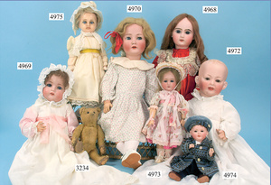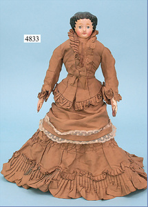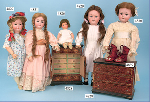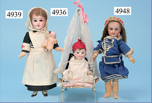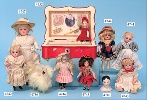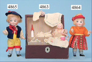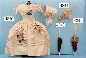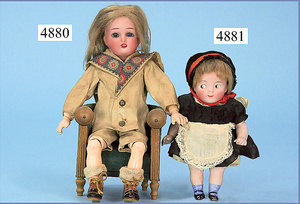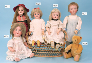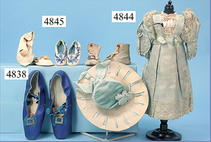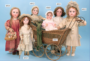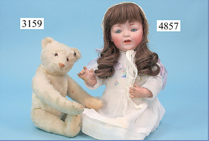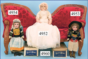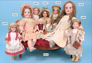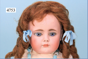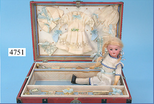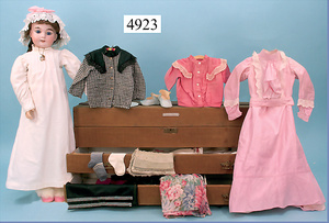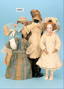 JUMEAU Biskuit-Porzellankopf-Puppe, Dep. Tête Jumeau, S. G. D. E. 13VX, blauer Körperstempel, Etiquette BEBE JUMEAU DIPLÔME D'HONNEUR, 75 cm, Biskuit-Kurbelkopf, blaue fest eingesetzte Glasaugen, geschl. Mund, durchst. Ohren, franz. Gliederkörper, Körper 1 x farbl. überarbeitet, schönes Porzellan, sehr schöne Ausstattung, Kleid, Unterkleid, Strümpfe u. Schuhe, Orig.-Korkdeckel, Echthaar-Perücke, Kleidung mit kl. altersbed. Fehlern, Seidenschleife verschlissen, Brosche mit Gravur: Edith