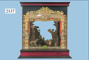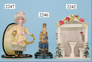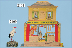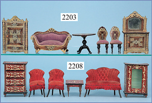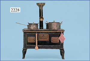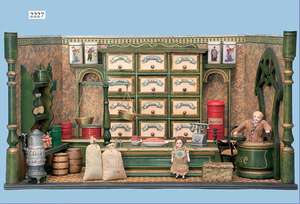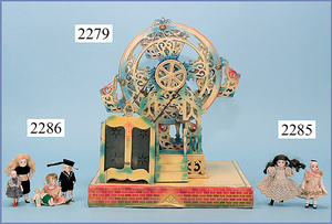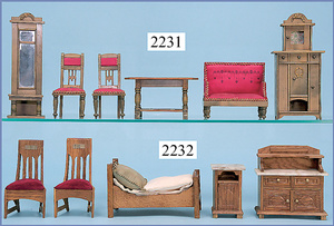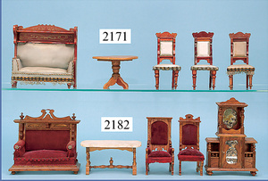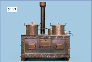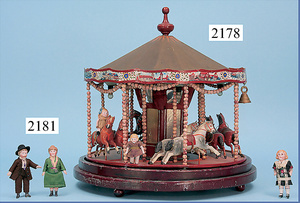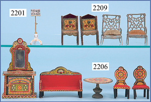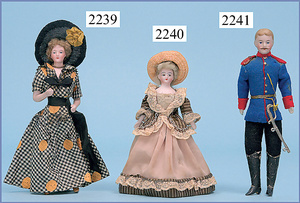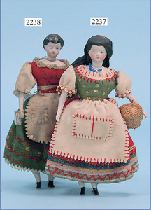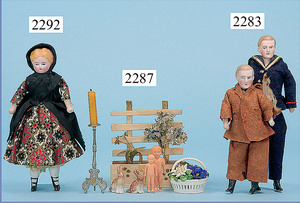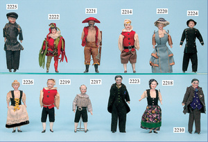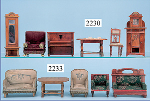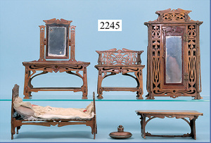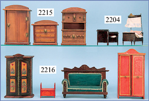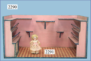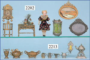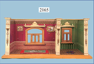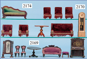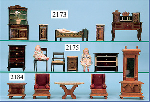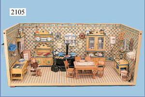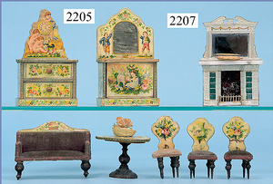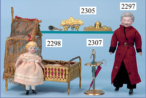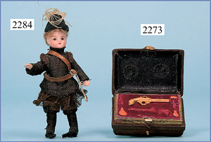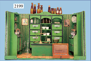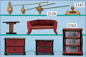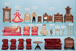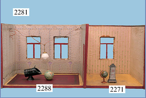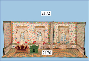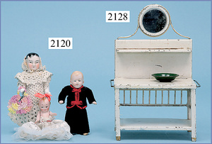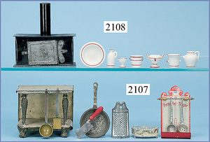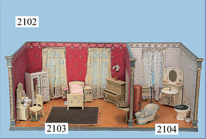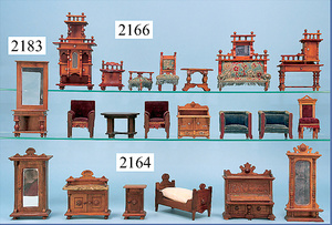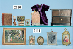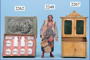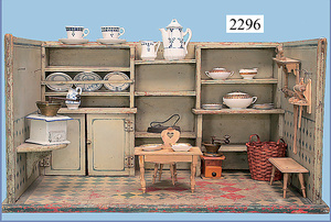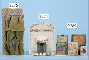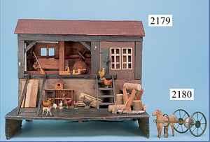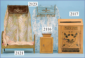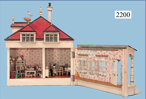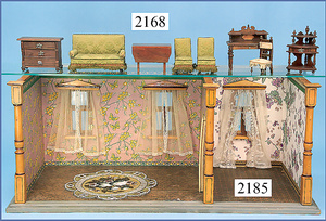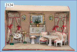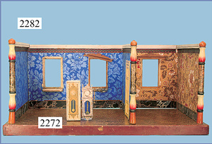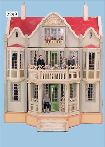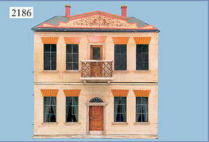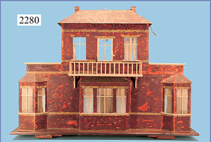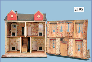 HACKER engl., herrschaftl. Puppen-Haus, wohl vor 1900, 57 cm breit, 66 cm hoch, 63 cm tief, 8 Zimmer u. Flur, beidseitig bespielbar, Durchgangstüren, fest eingebaute Kamine, kl. eingebaute Küche mit Küchenschrank, Orig.-Tapete innen u. außen, hinten u. vorne zum Öffnen, 6 Fenster, Eingangstür-Überdachung durch Säulen getragen, kl. Vorgarten, altersbedingte Lackfehler, Glasscheiben an den Fenstern müssen teilw. ergänzt werden, insgesamt schöner Orig.-Zust. für die Zeit, jeweils seitlich kl. Brett an den 2 kl. Giebeln ergänzt, in der Küche neben eingebautem Schrank eingebauter Backofen,